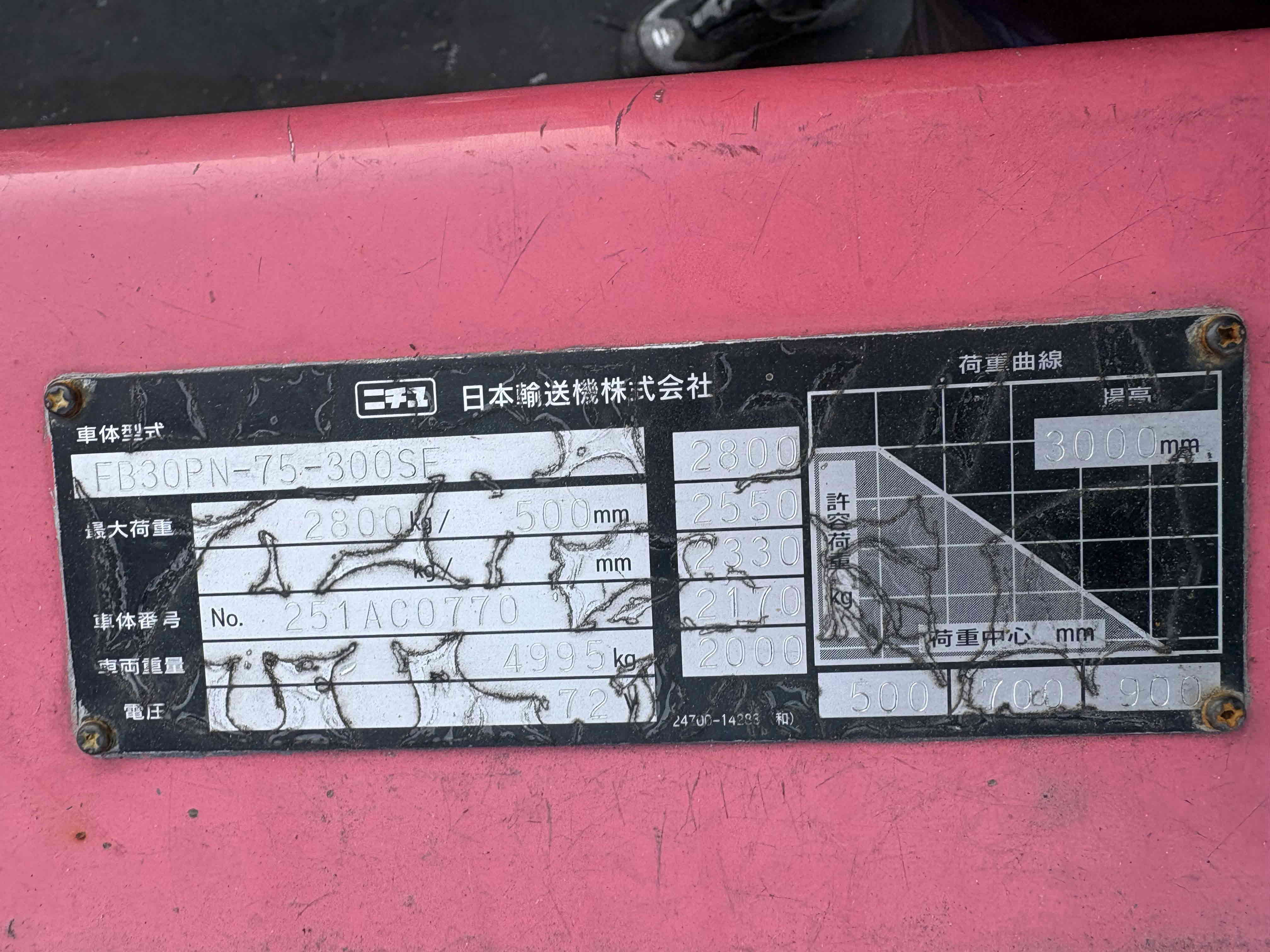 작업 효율을 극대화시켜 줄 강력하고 정밀한 일본산 전동 지게차, 니쯔유 3.0톤 좌승식 지게차를 판매합니다. 필수 옵션인 **사이드쉬프트(Side Shift)**가 장착되어 있어 물류 작업 시 정확하고 신속한 하역이 가능합니다.
